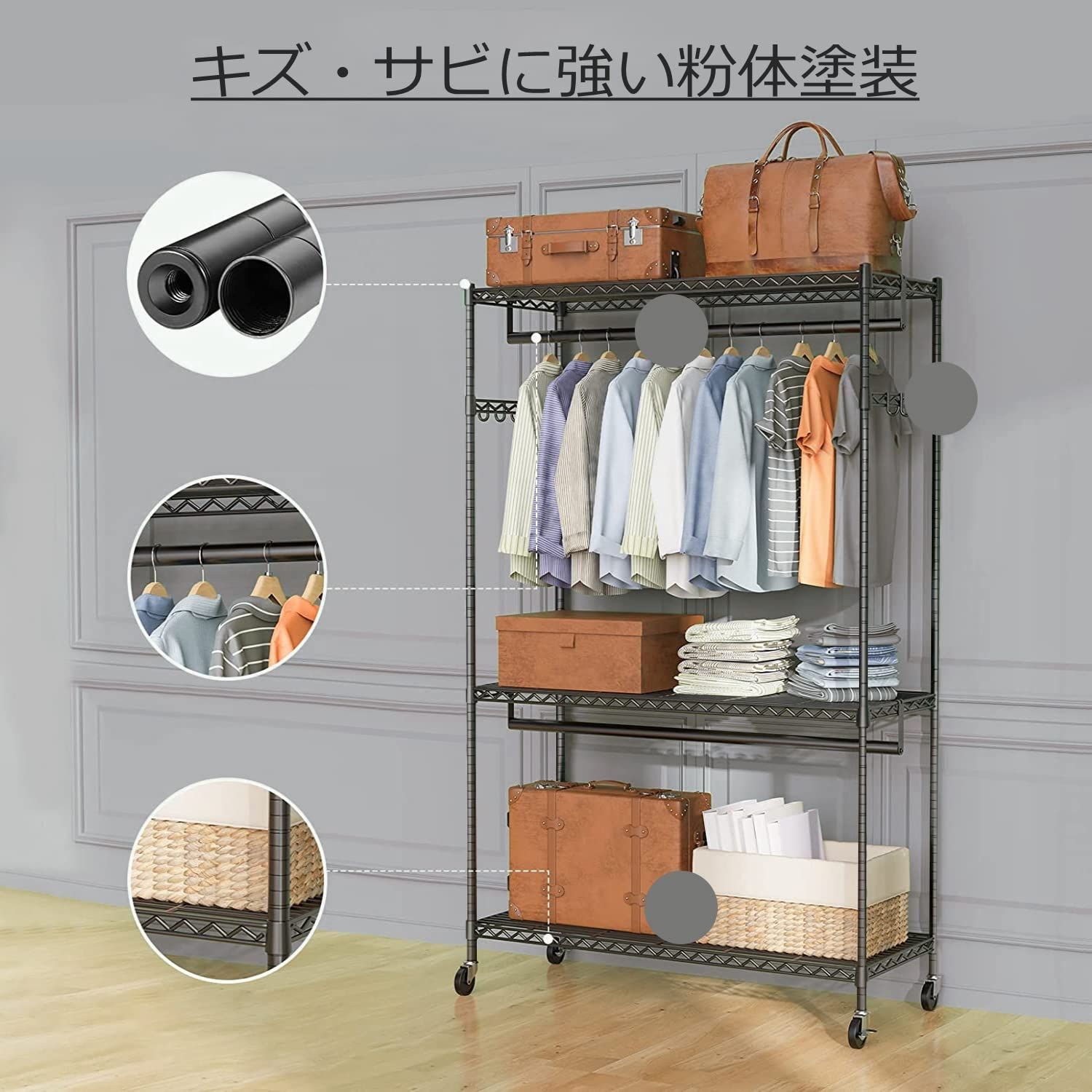 ワードローブ 大容量 キャスター付き 頑丈 洋服ラック 棚付き ハンガーラック 洋服掛け スチールラック Huaniun 幅120×奥45×高さ205 cm