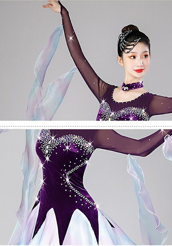 社交ダンスドレス フロート 上品 競技用 社交ダンス衣装 ワンピース ドレス キラキラ 社交ダンス ダンスウエア 広がる 舞台 豪華 長袖 ワルツ 発表会 団体 パーティー デモ 黒 S M L XL 2 3