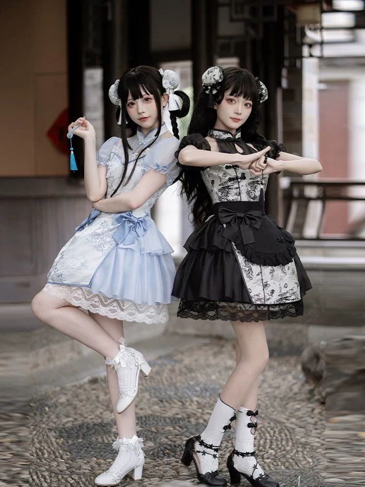 ドレス チャイナ風 ロリィタ セットアップ 地雷系 サブカル 天使界隈 量産型 サイバー y 2 k 原宿 渋谷 推し活 病みかわ 水色界隈 かわいい コスプレ キョンシー 半袖 ガーリー系 ロリータ フリル コンカフェ