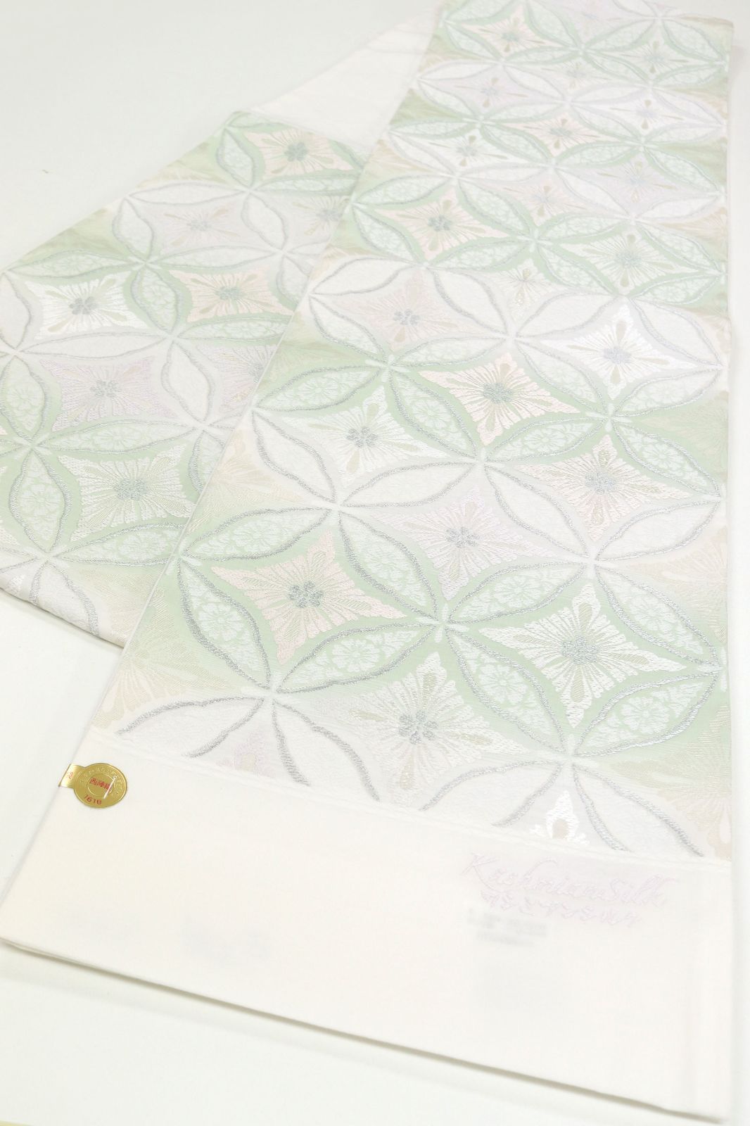 しなやかな帯地は、オフホワイト色、薄緑色のお色目で横段状にぼかすように織り上げられております。