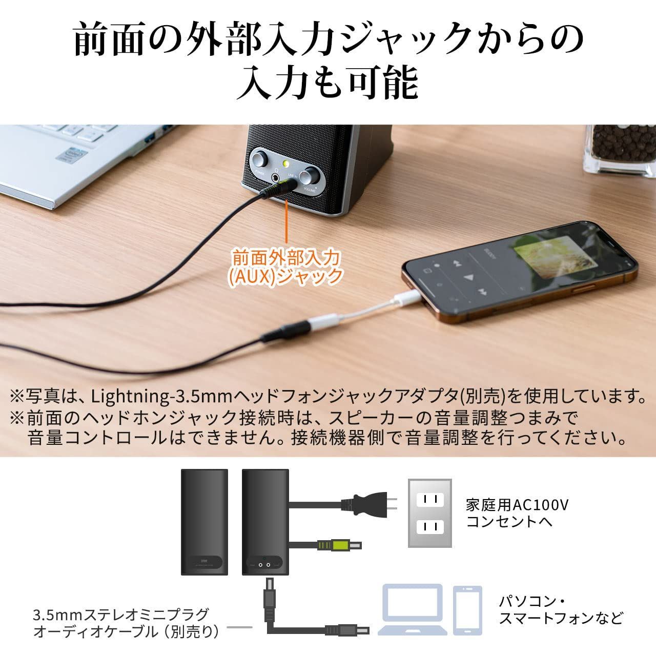 電源スイッチと音量調節つまみが付いているので、電源ON/OFFや音量調節も手元で操作できます。●アンプ内蔵で、パソコンやMP3プレーヤーに接続するだけで手軽に迫力の高音質サウンドを楽しめます。