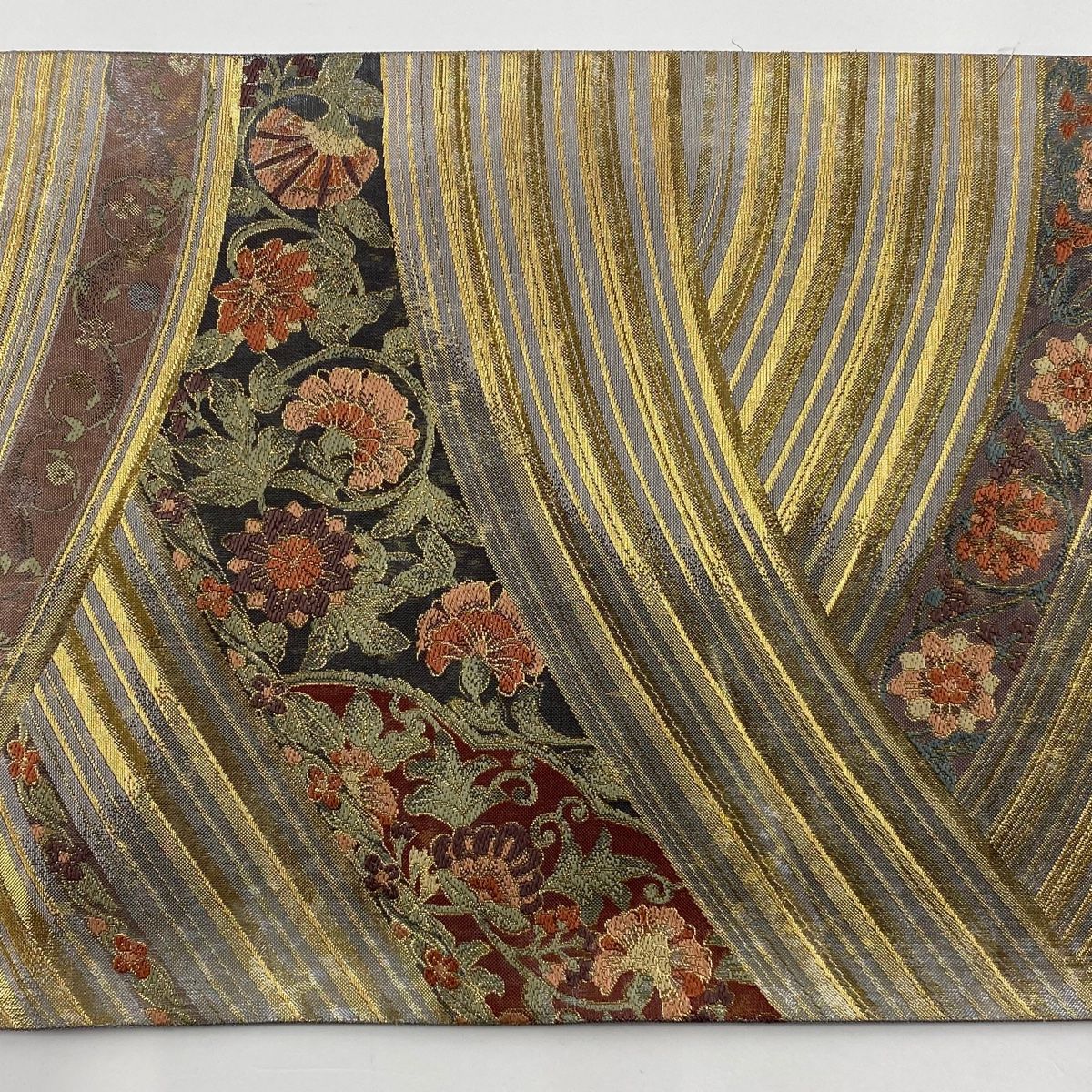 袋帯 秀品 花唐草 斜縞 金糸 箔 灰紫 六通 正絹