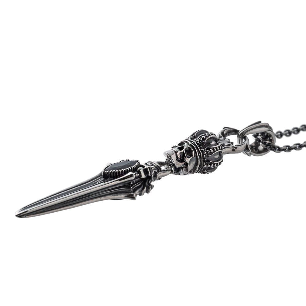 クラウン × スカル × ダガーが一直線に連なる、威厳あるデザイン。ダガーにはマーキスカットのブラックCZをセットし、いぶし仕上げのSV925と強いコントラストを生みます。ミル打ちの縁取りや溝のラインまで丁寧に彫り込み、光と影がはっきり出る立体感に。背面にはブランド刻印と〈925〉を刻み、品質の確かさを示します。アトリエで職人が一点ずつ成形・研磨し、エッジの角度や厚みまで美しく整えました。クラウンは“勝利”、剣は“正義”、スカルは“今を生きよ(メメント・モリ)”の象徴。同シリーズのアイテムと重ねれば、コーディネートの完成度がさらに高まります。※ペンダントトップのみ(チェーンは別売)。