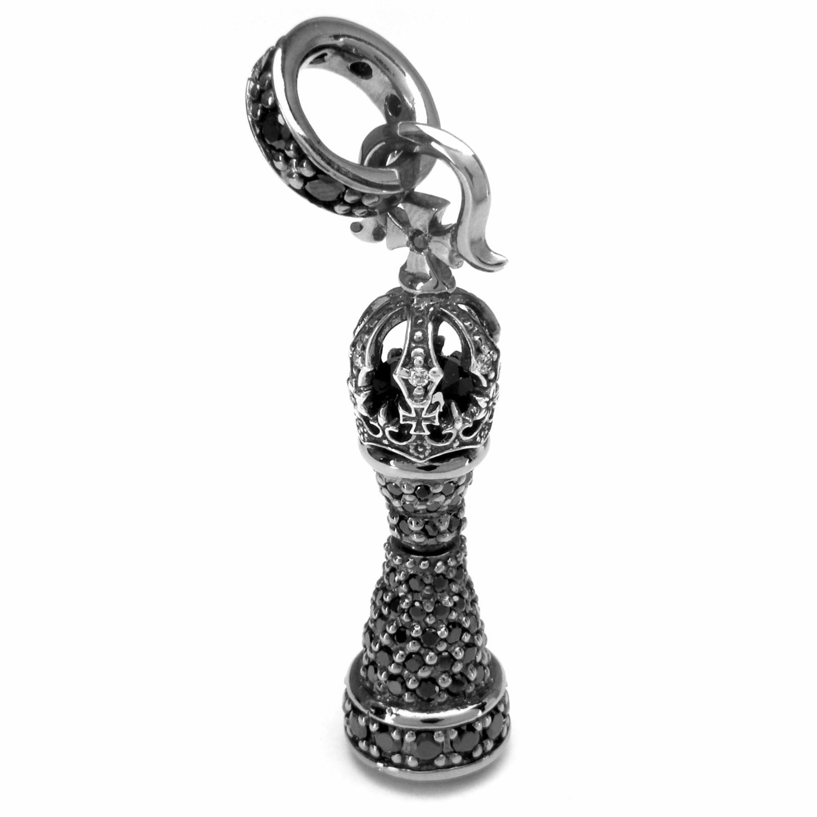 Majestic in scale and detail, the Chess King Pendant commands attention. Inspired by the king piece, its weighty silhouette is intricately carved and set with stones for a presence that feels both authoritative and refined. A deep black coating lends chic, shadowed depth, while the body is pavé-set with countless black zirconia—each movement releasing a fine, controlled shimmer. The openwork crown at the top speaks of sovereignty, and a lab-grown alexandrite mounted at the base shifts mysteriously from pink to purple as the light changes. Even the bail is stone-set, completing a design that reads like a small work of art. Hand-finished in our trusted workshop from forming and setting to the final polish, this is a statement on its own—and irresistibly dramatic when paired with the Queen charm.