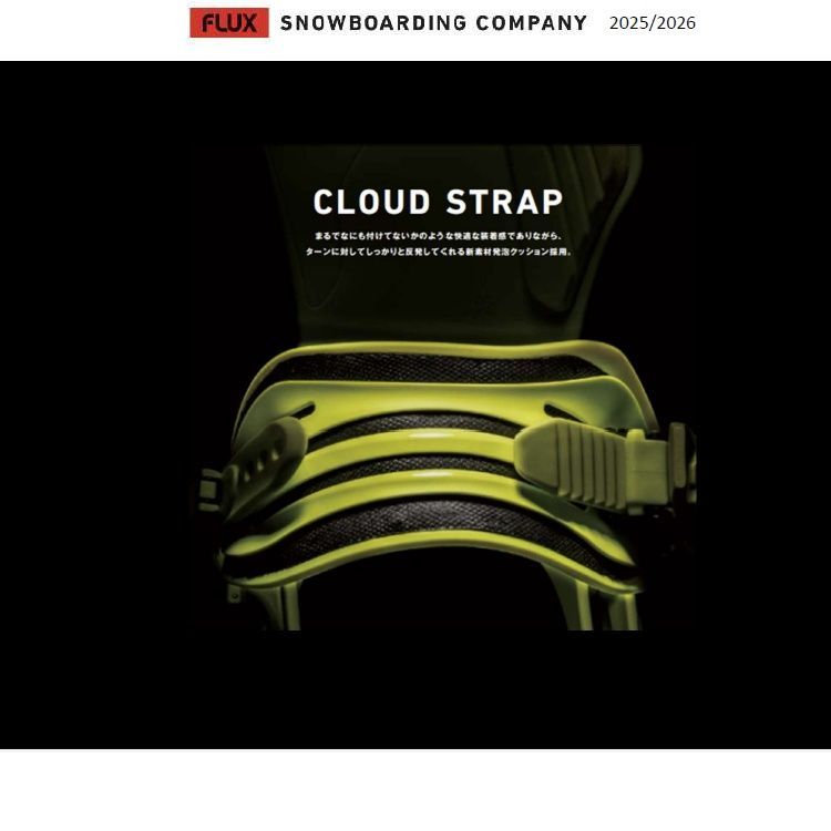 ベースプレートに軽さと扱いやすさをアップした新配合グラスファイバーフライトグレードを採 用。さらに柔軟かつ反発のある新素材ストラップはジブでの瞬時な動きと可動域、グラトラでの スピンの回しやすさを向上させる。