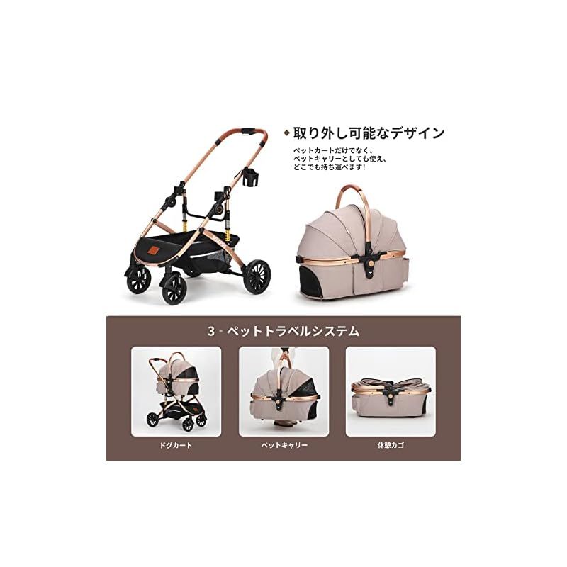 ペットカート 分離型 犬用ベビーカー いぬ用 バギー 折りたたみ式 ペットバギー 前輪360°回転 後輪ブレーキ付き 組み立てビデオ 耐荷重20 Kg 小型犬 中型犬 カーキ 1