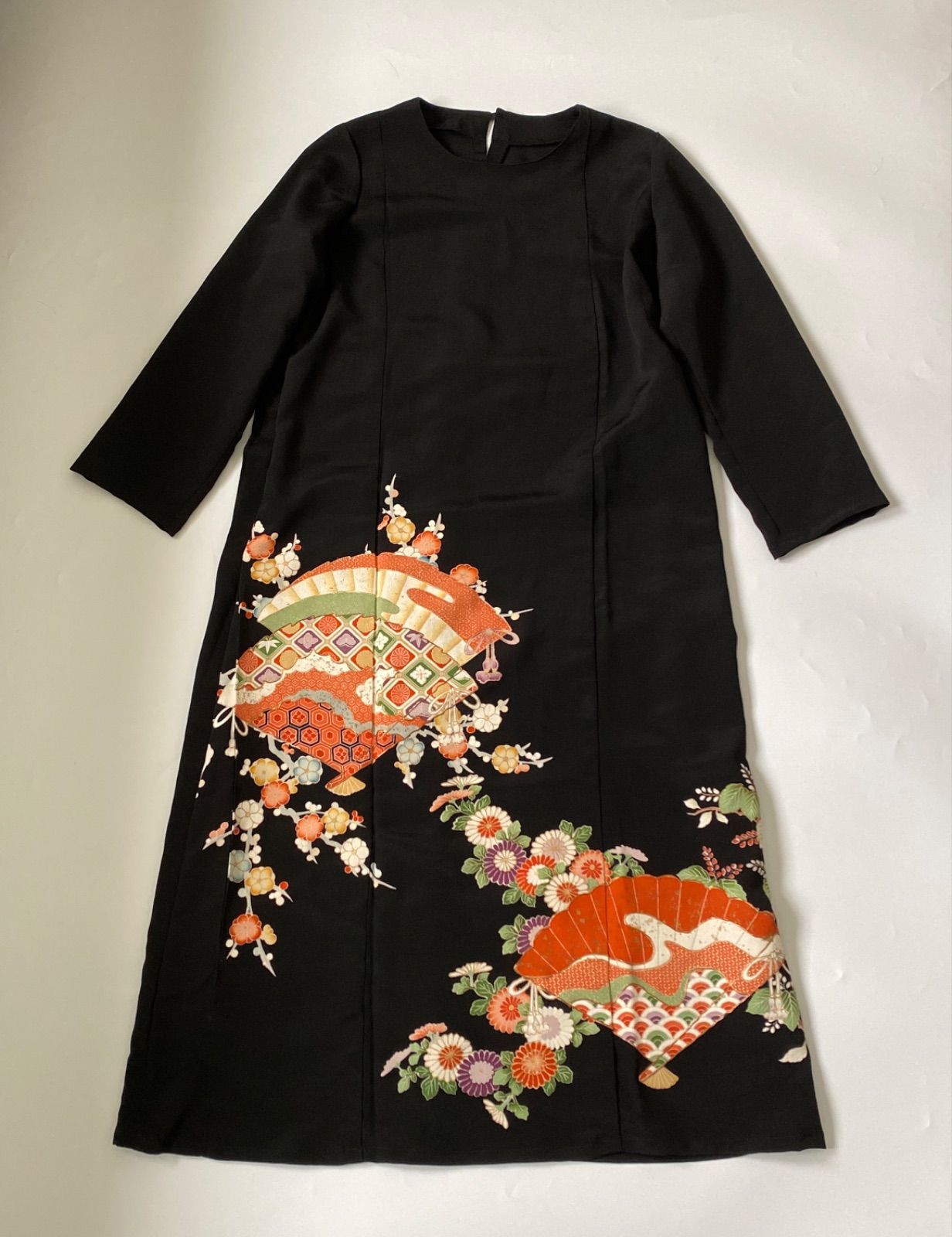 新品の黒留袖をリメイクした、鮮やかな扇と花柄が美しい、Aラインのハンドメイドのワンピースです。