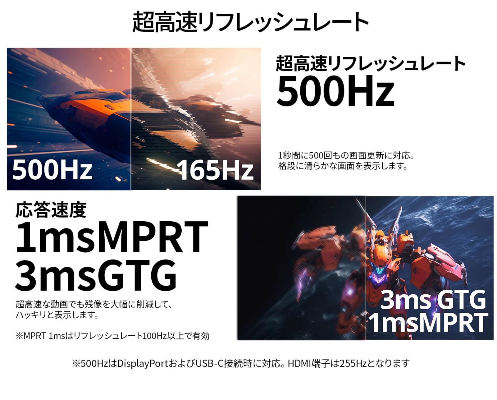 1ms(MPRT)の高速応答速度、500Hzの超高速リフレッシュレートを実現、高精細で滑らかな表現を可能にし、より快適なゲームプレイを実現します。*MPRTはリフレッシュレート100Hz以上で可能。500Hzの超高速リフレッシュレートは、驚異的な速さと滑らかさで映像を高速に映し出し、プレイヤーの可能性を最大限引き出します。