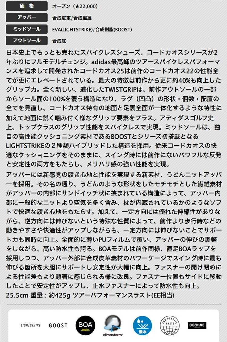 仕入品 87フットウェアホワイト ブラック adidas アディダス ゴルフシューズ NKZ 93 コードカオス 25 ボア BOA EE相当 ダイヤル式 スパイクレス メンズ