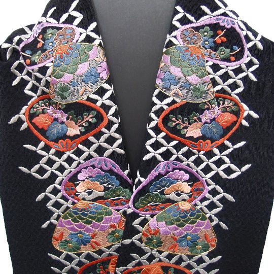 半衿 手刺繍 正絹縮緬 大正ロマン 振袖 黒 現品限り h 946