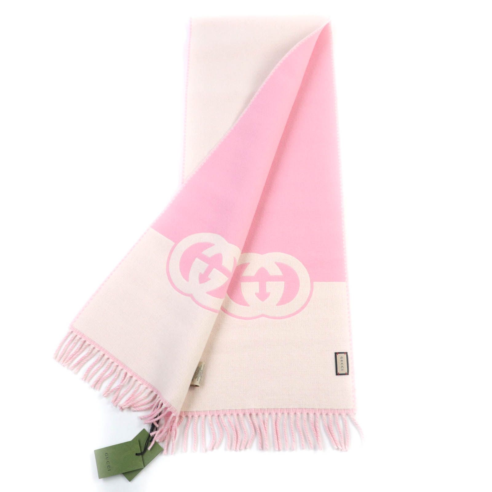 GUCCI グッチ 715497 カシミヤ混 フリンジ付 インターロッキングG スカーフ マフラー アイボリー ピンク き イタリア製 レディース