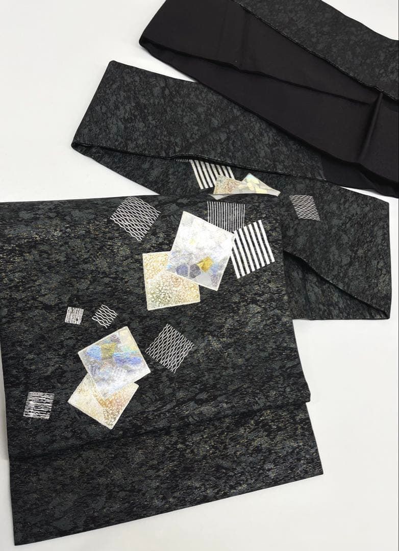 堀省平 九寸名古屋帯 落款入 金彩 幾何学模様 正絹
