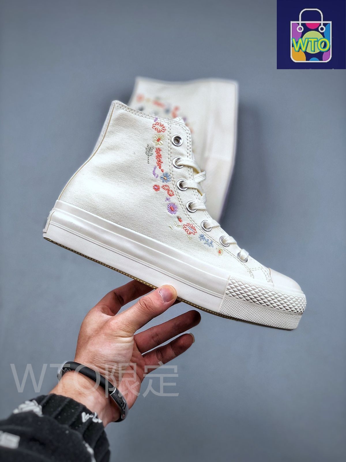 この Converse All Star Lift は、硫化工芸によって作られています。クリーンでクラシックなキャンバス製のシューボディに、色鮮やかな刺繍の小さな花が飾られています。春を靴に刺繍したようなデザインで、とても素敵です。厚底デザインで 3cm のエンハンスを実現しながら、非常に軽量で、履き心地が良いです。