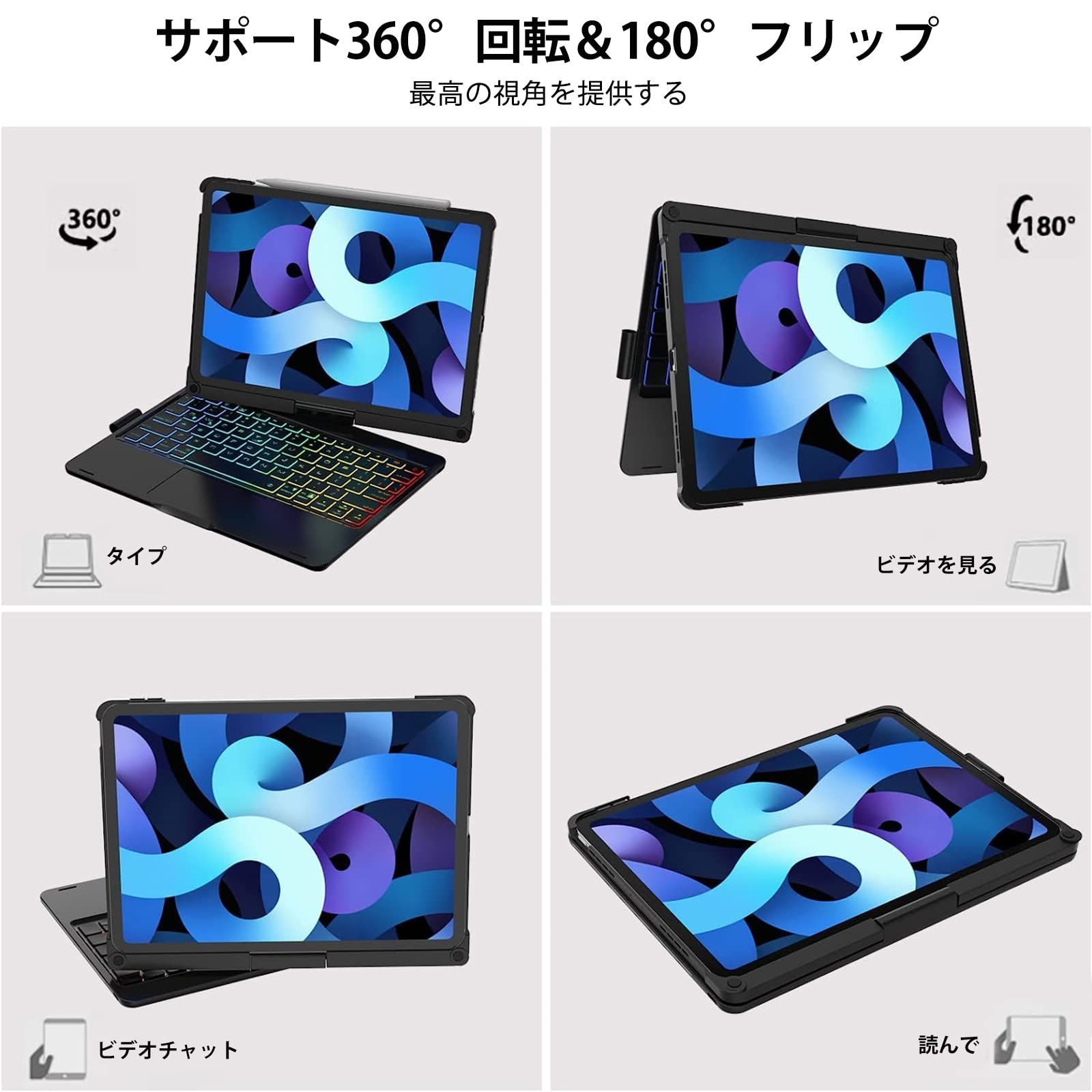 【360°回転&180°フリップ】 iPad air 第5世代 キーボード付きケースはiPadをノートパソコンように使用できる以外に、7つの異なるモードで使用できます。どんな角度にも調整でき、画面を360度回転でき、180°裏返す操作し、横向きに立てかけて、お気に入りの番組を視聴したり、絵を描くんだり、読書、WEBなどを楽しめます。キーボードが不要な時、iPadケースを反転できます。ミーティングや仕事など実用性が高くて便利なbluetooth iPad 10.9インチ キーボードケースです。