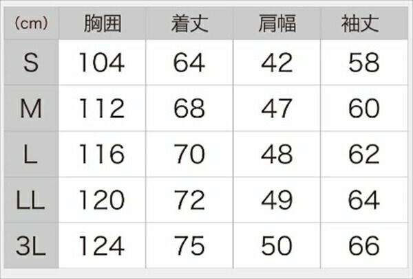 寸法:胸囲116、着丈70、肩幅48、袖丈62cm