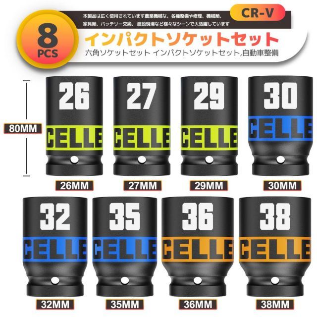 このインパクトソケット、車の修理やメンテナンスに使用できます。26mm〜38mmの8ピースドライブインパクトソケットセット一式。含む:26mm27mm29mm30mm32mm35mm36mm38mm計8個。車やバイク整備から日曜大工まで使用頻度の高いサイズを網羅