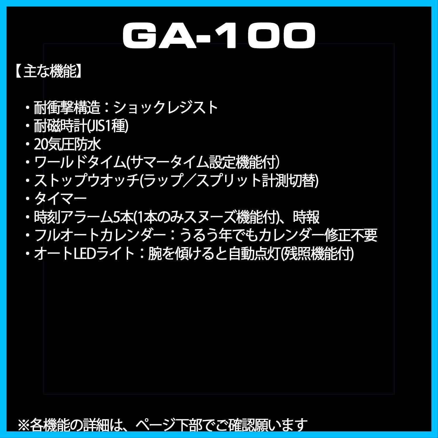 ワイドフェイスが好評のアナログとデジタルのコンビネーションモデル、GA-100からNewカラーが登場。マット仕上げのケースとバンドには、G-SHOCKのブランドカラーであるブラック×レッドとシンプルなホワイト×ブラックの2色を採用。文字板には4つの液晶窓とスピードインジケーターをシンメトリーにレイアウトし、すっきりとしたフェイスデザインに仕上げた。また、1/1000秒計測ストップウオッチや速度計測機能、JIS1種耐磁性能を搭載し、高い実用性も誇ります。ストリートファッションシーンで映えるタフなNewモデル。