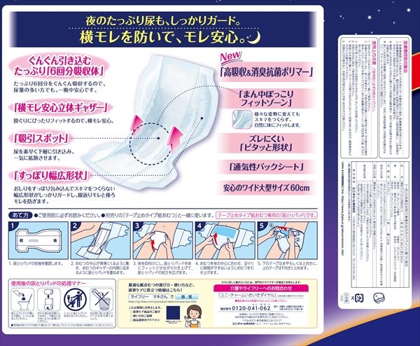 たっぷり6.回分をぐんぐん吸収するので、尿量の多い方でも一晩中安心な尿とりパッドです。1.引き込み吸収ラインが尿を素早く下層に引き込みスピード吸収。2.山折フィットゾーンがどんな姿勢でもスキマをつくらずフィット。3.寝た姿勢でもおしりまで包み込むワイド大型サイズ6.0cm。4.立体ギャザーが体にフィットして横モレにも安心。5.通気性バックシート採用で、おむつ内部の湿気を外に逃がすのでムレにくい。