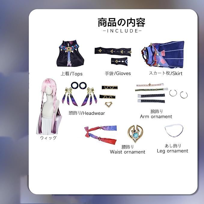 セット内容:衣装だけでなく、アクセサリーや小物も含まれており、キャラクターの個性をより一層引き立てます。