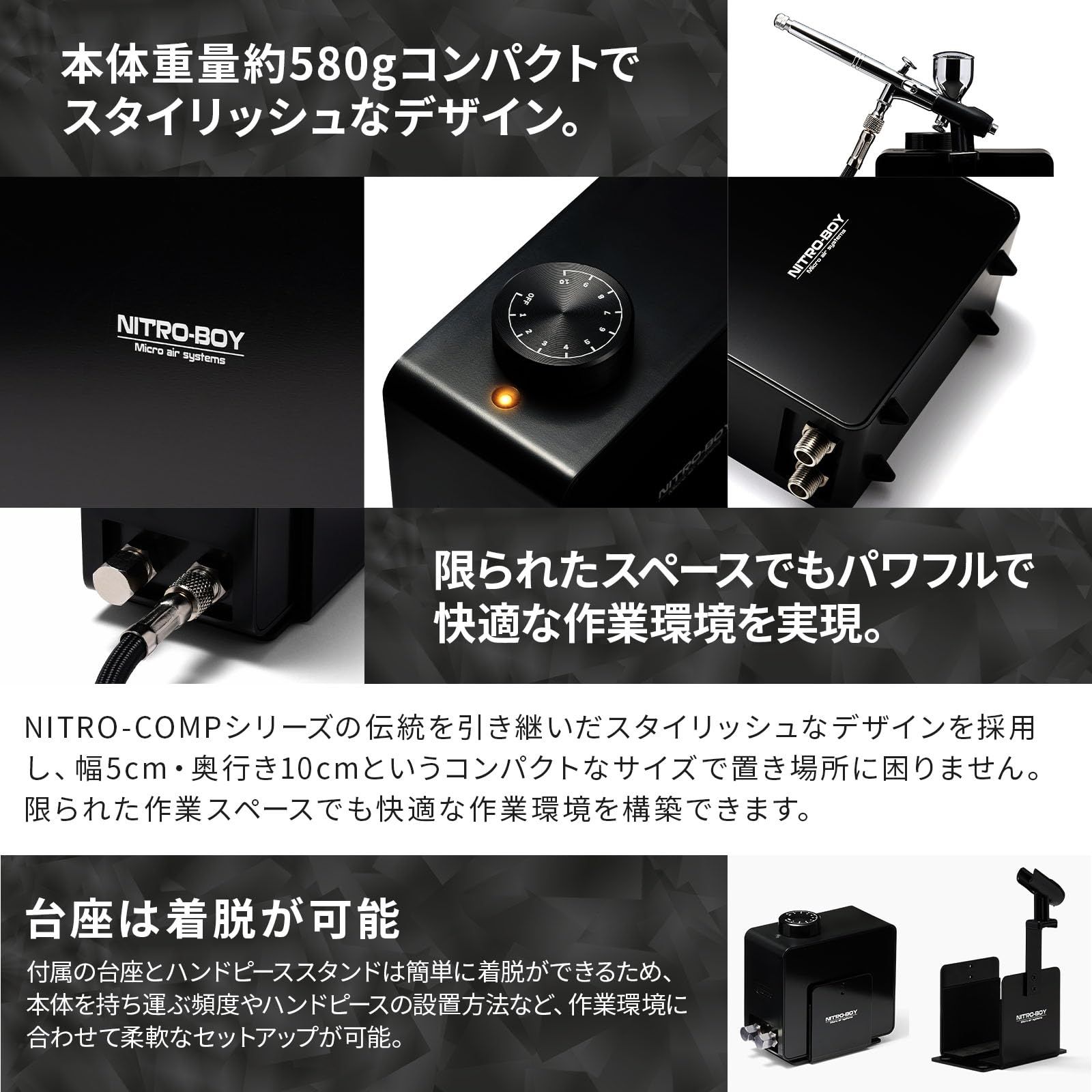 【PROFIXならではのこだわり抜いた設計定格圧力約0.08MPa(0.8bar)】NITRO-BOYはコンセントさえあれば、 どこでも手軽に使えます。 初心者から上級者まで、幅広いユーザーに愛用していただけるような高性能・高品質なミニコンプレッサーに仕上がりました。(※0.3mm口径のハンドピース使用時)