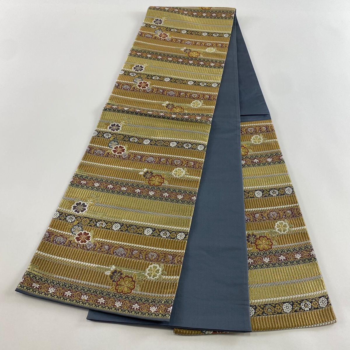 袋帯 秀品 鎧脅し 草花 金銀糸 箔 金色 六通 正絹