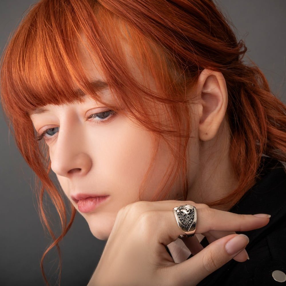 フランス王家の紋章であるフレアーデリスのモチーフ。堂々と鎮座するフレアーデリスが、指元に“紋章”の威厳を授ける幅広リング。頂点の稜線まで鏡面に磨き上げたエンブレムを中心に、左右には唐草と薔薇、教会装飾を想わせるトレサリーを細密に彫刻。燻しの黒が奥行きを生み、輝くシルバーとのコントラストが立体感を際立たせます。内側は滑らかに仕上げ、幅広でも装着感はまろやか。壮麗さと気品を兼ね備えたゴシックリング。特別なギフトにも最適です。ブランド意図を継ぎ、提携工房が一品ごとに丹精を注いだプロダクトです。
