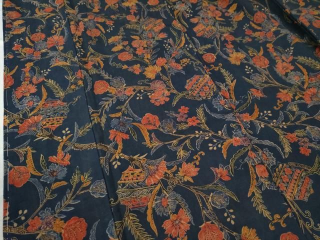 平和屋着物 上質な小紋 紬地 型染め 更紗花唐草文 正絹 yc