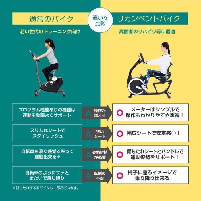 健康づくりやリハビリ向けのバイクで、運動に自信がない方にもおすすめです。乗り降りしやすいステップスルー設計、操作が分かりやすいメーターパネルで運動をサポートします。座面の高いフィットネスバイクへの乗り降りが不安な方に、リカンベントバイクAHE7020をおすすめします。