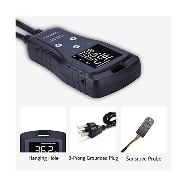 理想的な湿度制御 湿度コントローラーは、5%99%RHの制御範囲内で希望の湿度を調整および維持できます。湿度を確実に追跡するためのセンサープローブが付属しています。| 安全で信頼性の高い 湿度コントローラーは高湿度と低湿度のアラームをサポートしており、湿度範囲を超える影響からターゲットを保護するのに非常に役立ちます。湿度範囲とコンプレッサー遅延をカスタマイズして、デバイスを保護します。コントローラは、突然電源が切れた場合でも、データや設定を自動的に保存できます。| プラグアンドプレイ 3つのボタンで簡単に加湿・除湿モードの湿度範囲を設定できます。| 便利なデザイン イルミネーションLEDディスプレイは、暗闇でも読みやすく、プログラムも簡単です。また、湿度コントローラーを壁やフックに掛けて、コードをほぐしてきれいに保つことができます。| 用途 きのこ、ミニ温室、換気扇、クロールスペース、タートルエンクロージャー、養生室、種子発芽、葉巻貯蔵、自家醸造などに幅広く使用されます。||特徴| 大型液晶画面 検知した湿度、設定湿度を表示し、ディスプレイにカスタムアイコンで動作モードを表示します。| 使いやすさとプログラミング アプリケーションの2ステップ設定、プラグアンドプレイデザインのみ。 値を設定して湿度を制御します。| アラーム センサーの誤差や湿度が限界を超えた場合のアラーム。 湿度が高/低湿度設定値を超えたときにアラームを発します。|2m(6ft)の防水プローブコードで設置の柔軟性を高めます。|湿度100%の環境にプローブを置かないように注意してください。|ERRが表示された場合は、プローブをコントローラーにしっかりと挿入してみてください。|複雑なDIY配線を行わずに、まったく新しい配線済みの設計を使用しており、除湿/加湿装置を直接接続するためにアクセスできます。|アイレットタブからの吊り下げをサポートし、取り付け距離と釘/ネジのサイズを確認してから取り付けます。|標準の信頼性の高い3ピンアースコンセントは、10Aの最大電流をサポートします。|入力電源ケーブルの長さ:150cm / 5ft|出力電源ケーブルの長さ:18cm / 7in|グリーンハウス、マッシュルーム、種子発芽、自家醸造、換気扇、衣類乾燥機、寝室とエアコン付きの部屋、生鮮貯蔵、食品製造、実験室、レプチルなどに広く使用されています。|トカゲ、カメ、ヘビ、クモなどの爬虫類が孵化するのに快適な選択です。|複数の湿度コントローラーを備えた広大な部屋の湿度を制御するのが理想的です。|すべてが成長し始めたときに高湿度環境を制御するため。|それはおいしい食べ物を収穫するのに役立ち、あなたの平和を心に留めます。|
