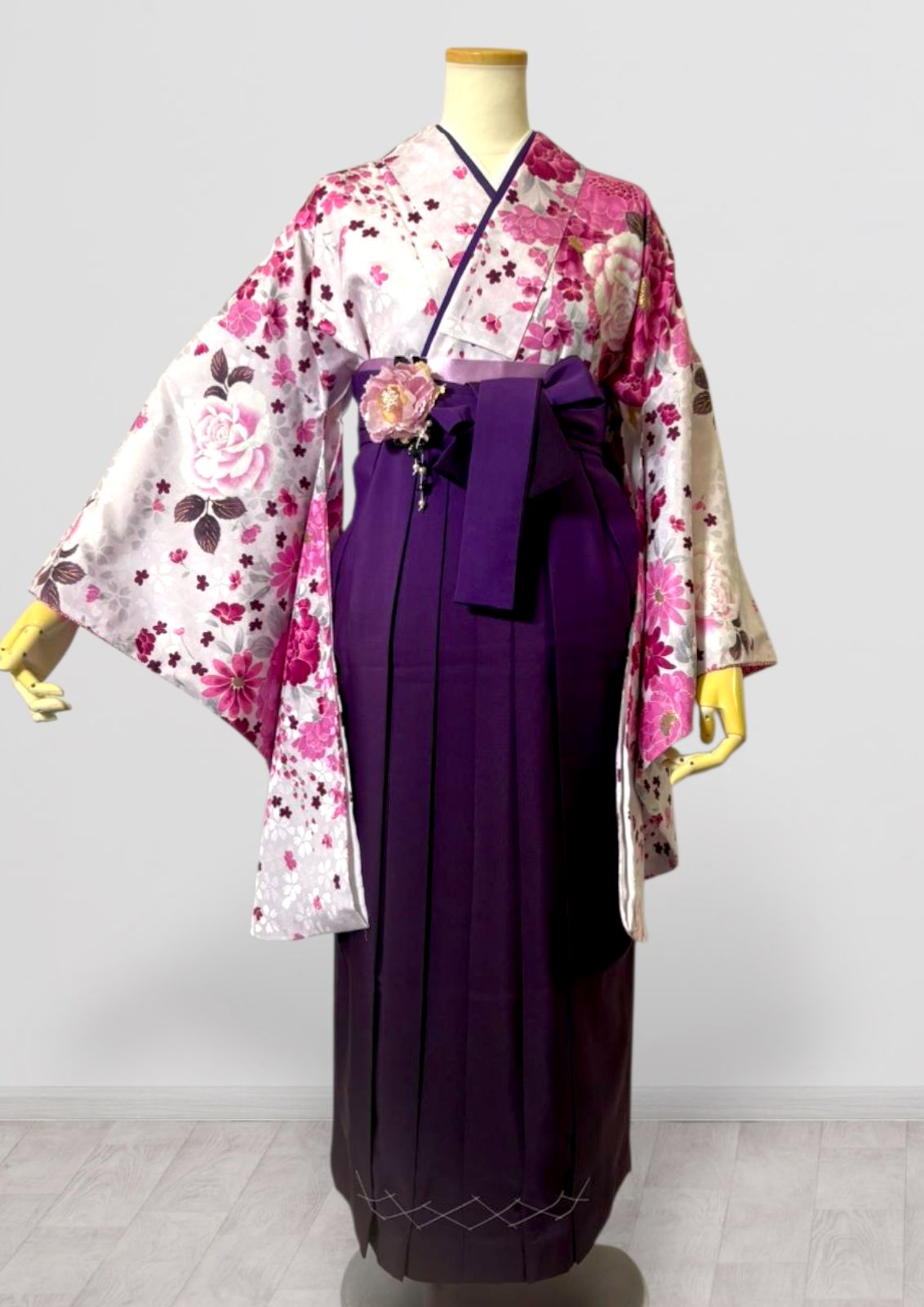 白地の着物に濃いピンクの大柄な花、そして深い紫の袴を合わせたスタイルは、非常に大胆でモダンなコーディネート。