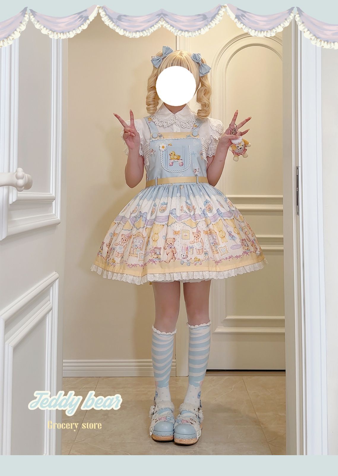 ロリータ くまモチーフ コスプレ衣装 高腰甘ロリデザイン ジャンパースカート 豪華3点セット リボン ヘッド 撮影会 舞台演出 推し活 プレ
