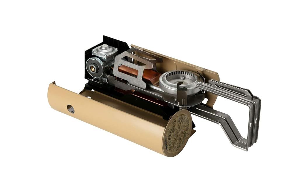 五徳をコンパクトに収納できる構造をもった、卓上ガスコンロ。