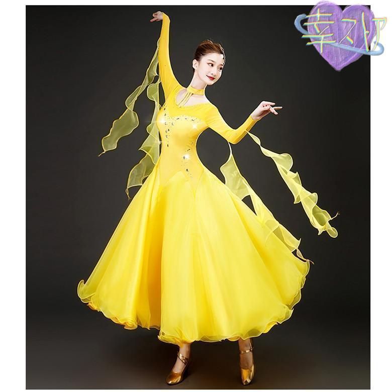社交ダンスドレス 社交ダンス モダンドレス イエロー 大きいサイズ 長袖 大きい裾 ドレス ワルツダンス ワンピースドレス ダンWP