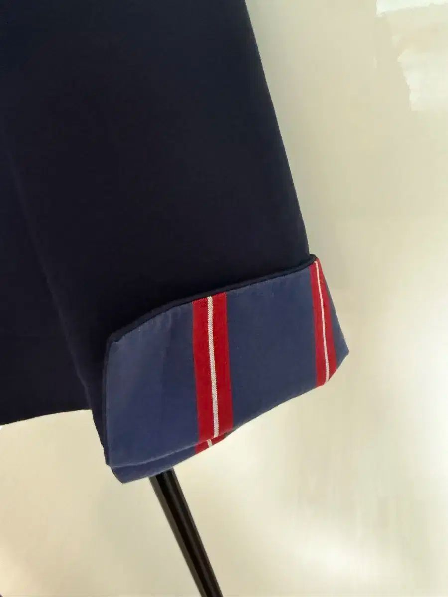 個性的な裏地とゴールドのボタンがポイント。すっきりとしたデザインで、さまざまな服装で使いやすいです