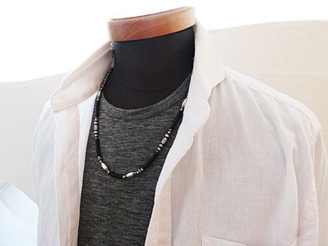 オニキスを中心に様々な形、大きさのナバホパールシルバービーズ、14金GFビーズ(ゴールドフィールド)を使用したカスタムネックレスになります。