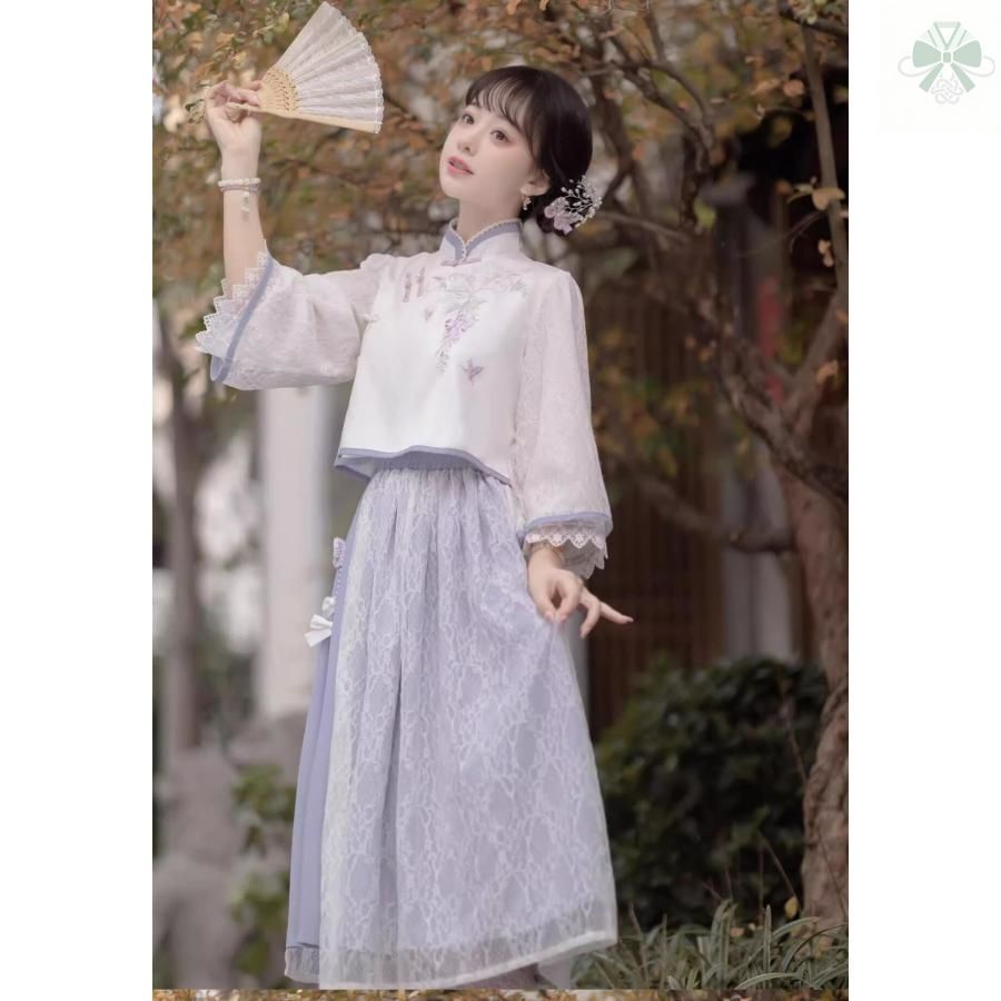 中華衣装 改良中華ドレス 七分袖チャイナ服 ミドル丈スカート 2点セット チャイナドレス レース 花柄 優しい紫 レディース 大人 中