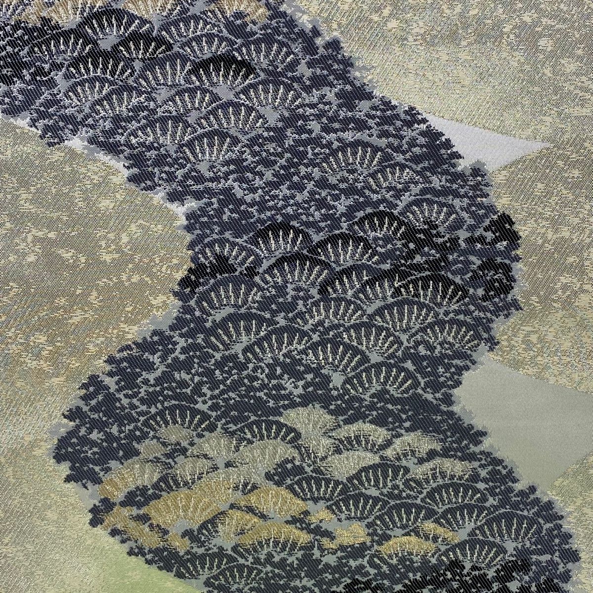 袋帯 秀品 服部織物 落款 こはく錦 笠松 流水 金銀糸 箔 銀色 六通 正絹