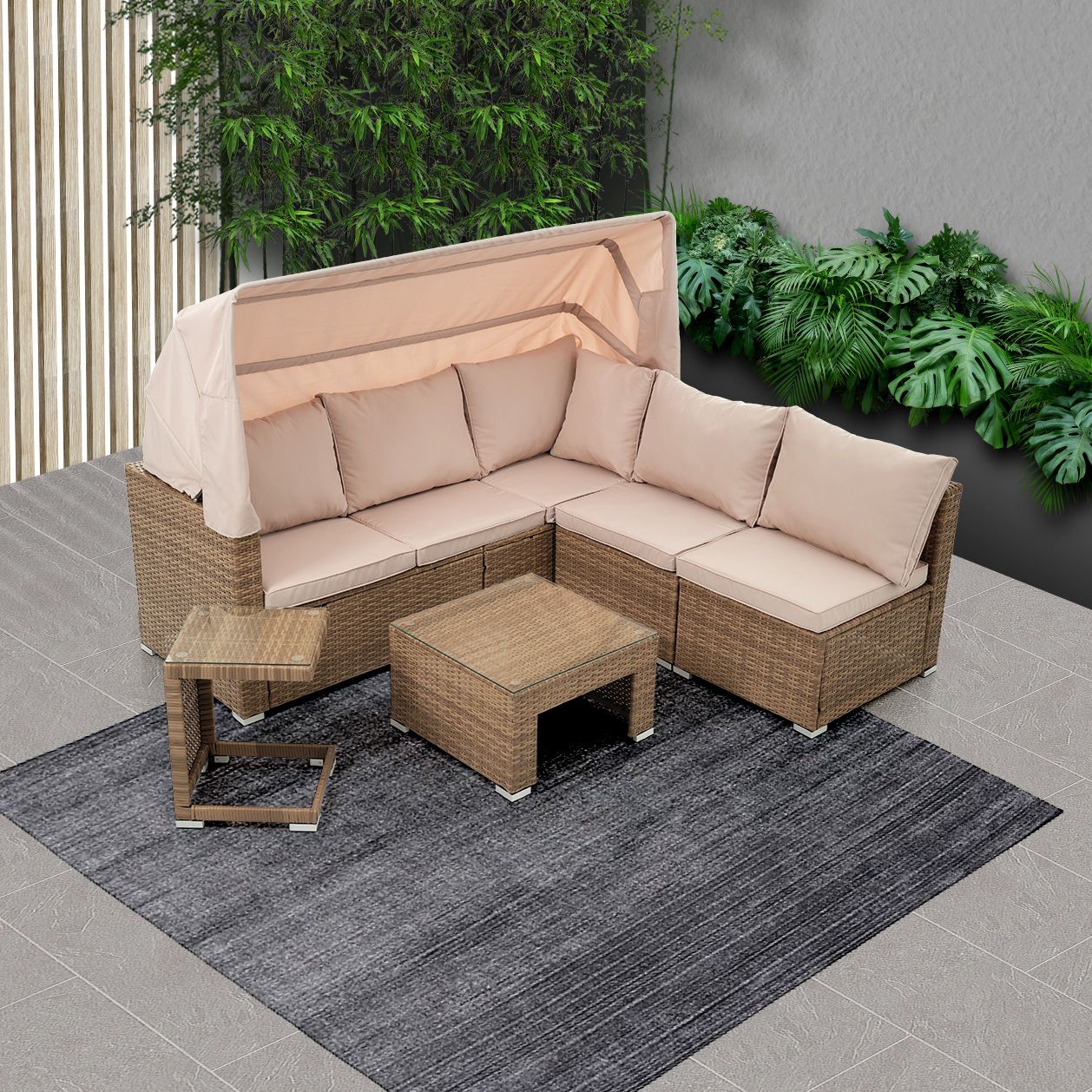 パラソル付き ガーデンファニチャー 5点 ガーデン テーブル チェアー ラタン調 家具 樹脂 楽組 ホテル カフェ ベランダ テラス ソファ ガーデンソファー ガーデニング